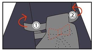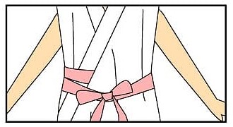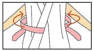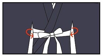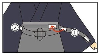 後ろから回した紐①のマジックテープと、袴の右側のマジックテープをとめます。