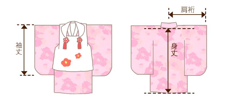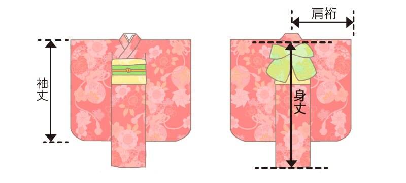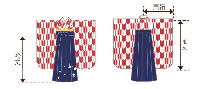 被布タイプ 帯タイプ 袴タイプ 身丈…長い場合は腰紐で調整します。 肩裄…手を斜め45度位にして、首のつけ根のから肩へかけて一度測り、そこを起点に手のくるぶしまでを測ります。 袖丈…袖の上端から下端までの長さ。 袴丈…袴の前側の紐下からの長さ。