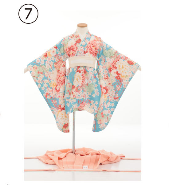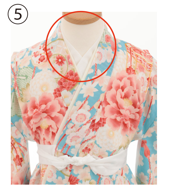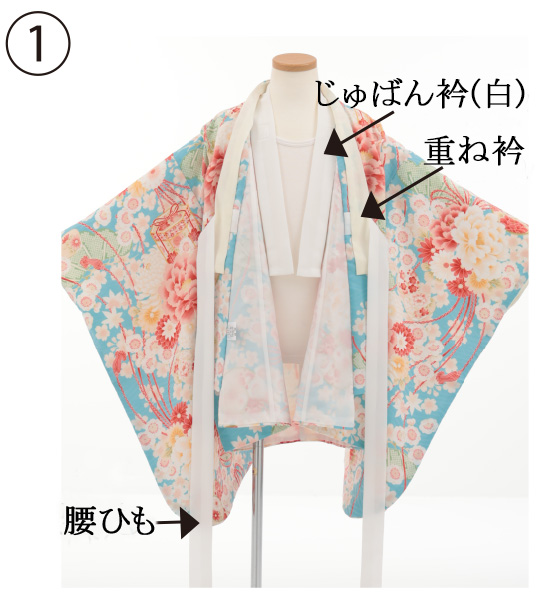肌着を着た上からじゅばん衿(白)、重ね衿、腰ひもがセットされた着物を羽織ります。