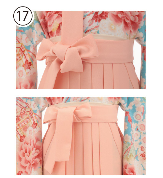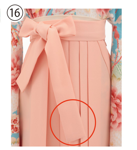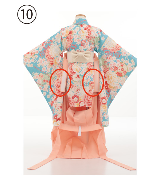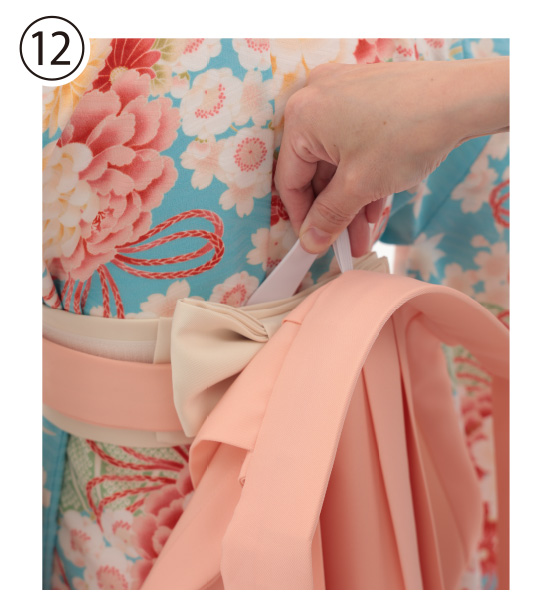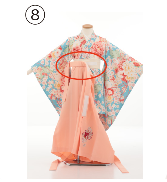 綺麗な着姿のポイントになりますので、しっかり差し込んで、リボンの上に袴の後ろ部分を乗せます。