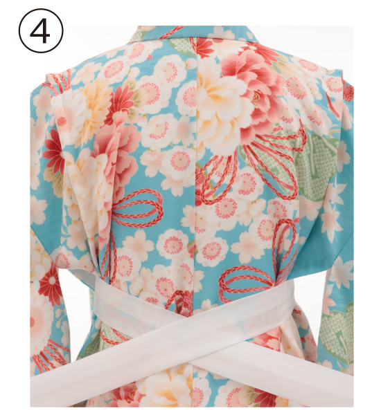 向かって左側のひもを右の脇の穴に通して後ろに回し、向かって右側の着物を重ねて、付いている腰ひもを後ろに回します。