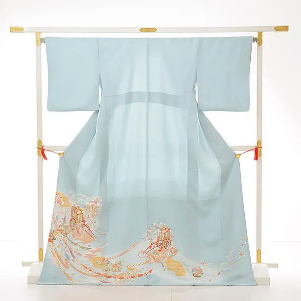 色留袖レンタル 737 京友禅 ブルーグリーン 古典文様 御所車に扇面