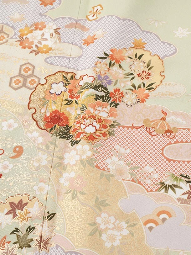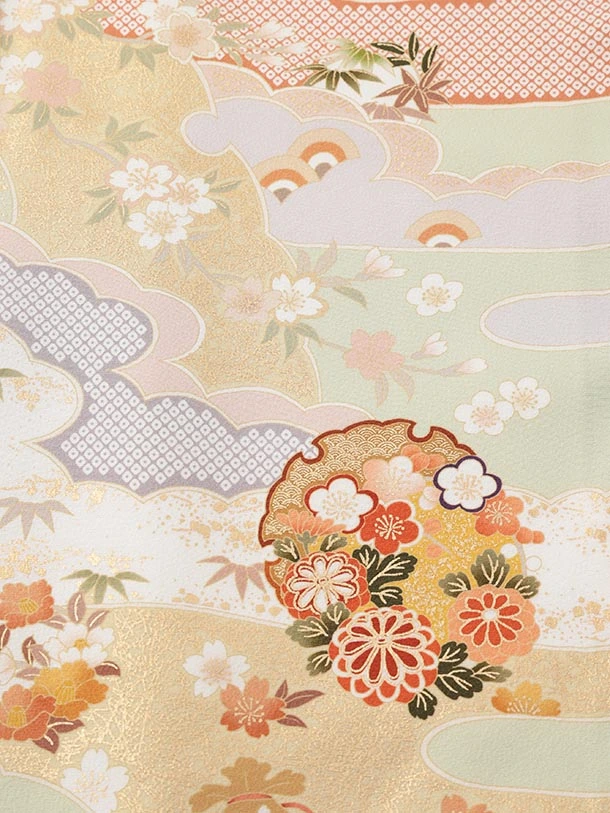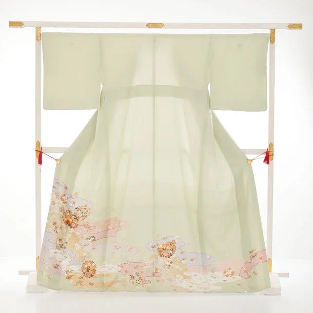 色留袖レンタルQ0761 ヒワ色雲取り霞に雪輪