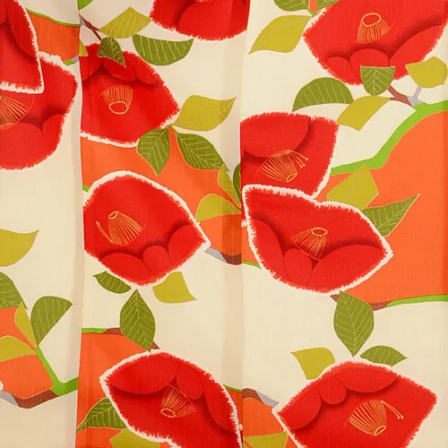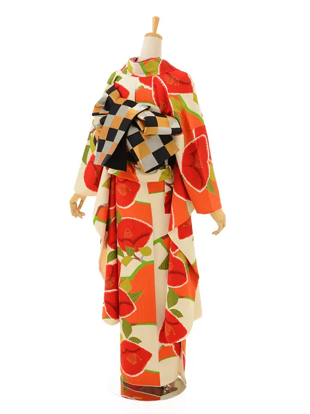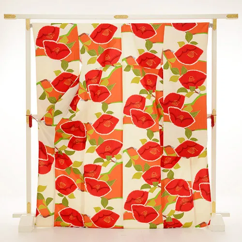 振袖レンタル886紅一点クリーム色×オレンジ赤椿