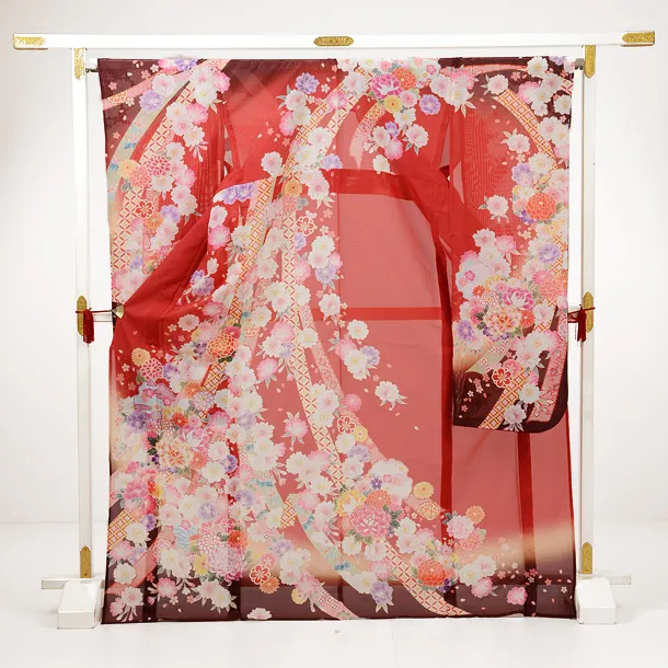 夏振袖 絽 900 赤地のしめ花(化繊)