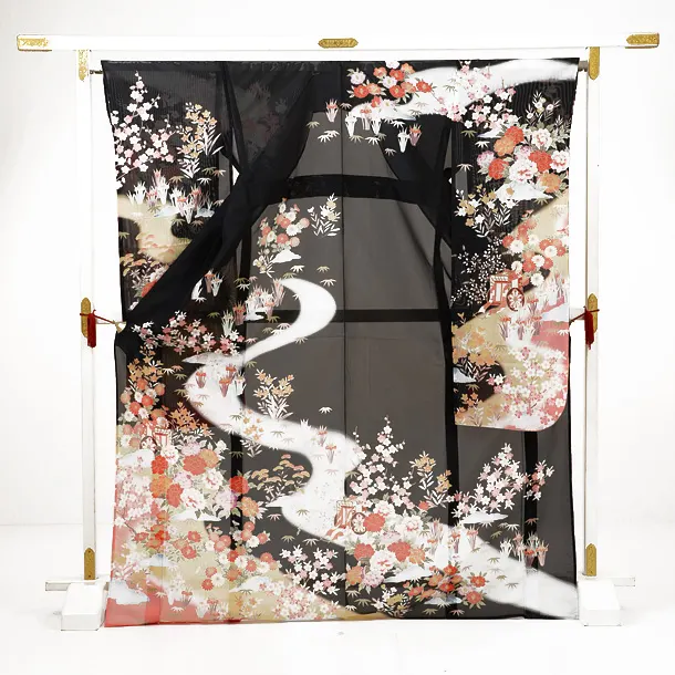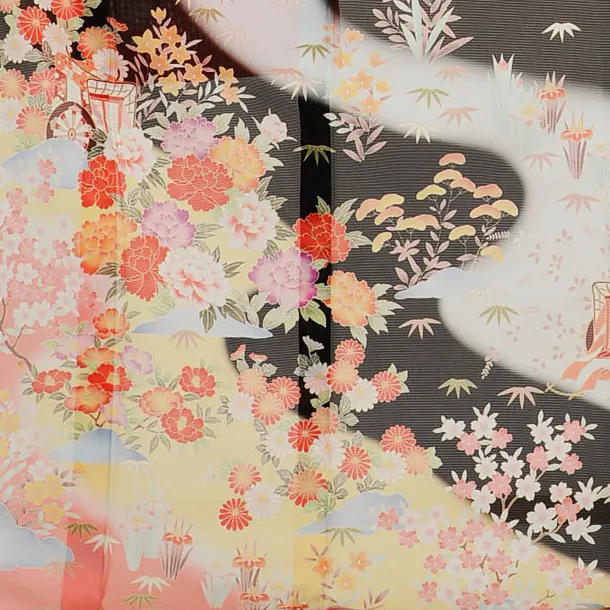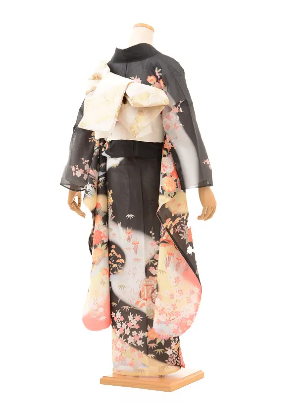 夏振袖 絽 914 黒地御所車に花(化繊)