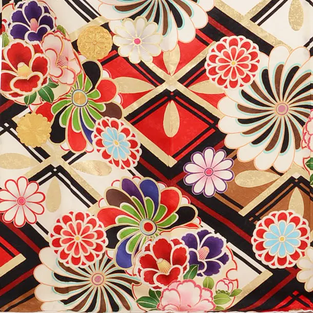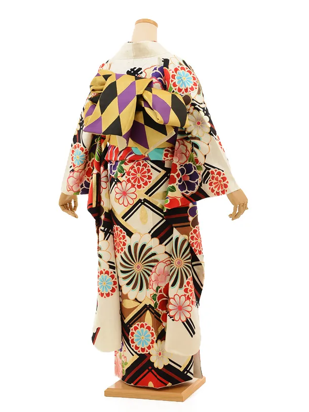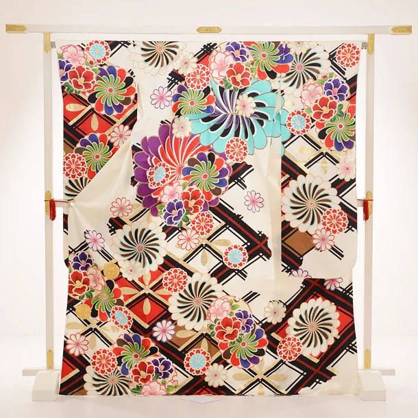 振袖レンタル936AMIAYA×紅一点クリーム地斜格子に椿