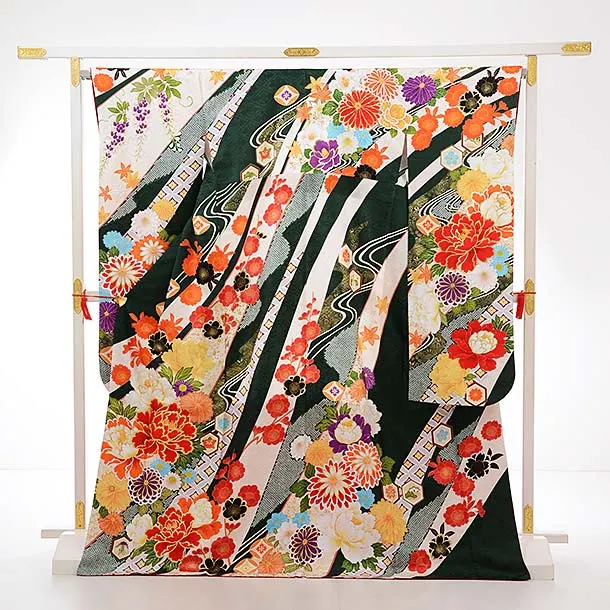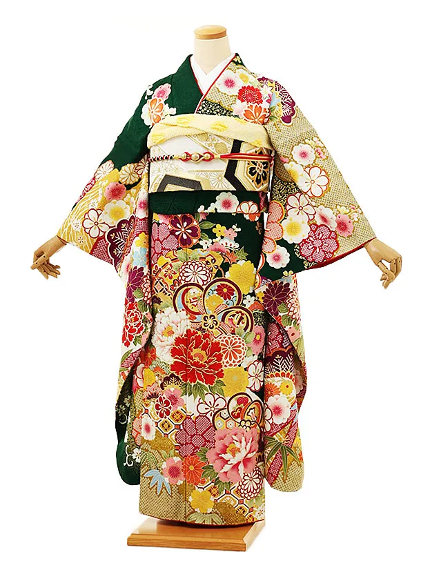 振袖レンタル1062緑地牡丹に梅七宝柄