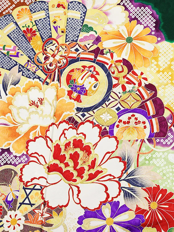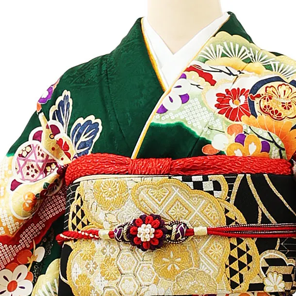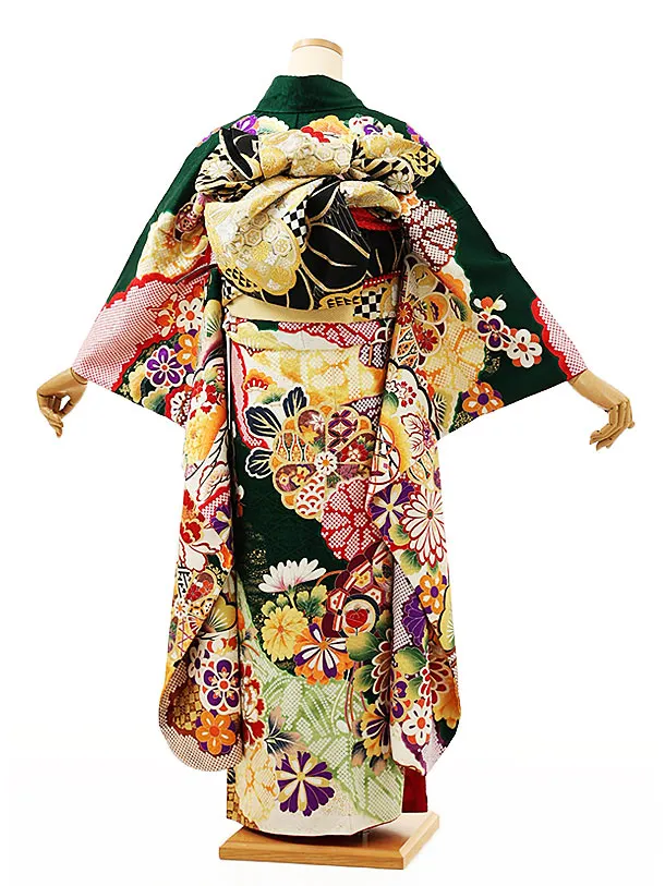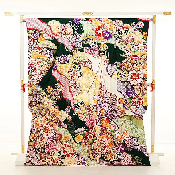 振袖レンタル1168 グリーン系 桧扇に菊牡丹