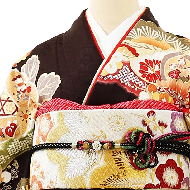 振袖レンタル1170 こげ茶地 桧扇に菊牡丹