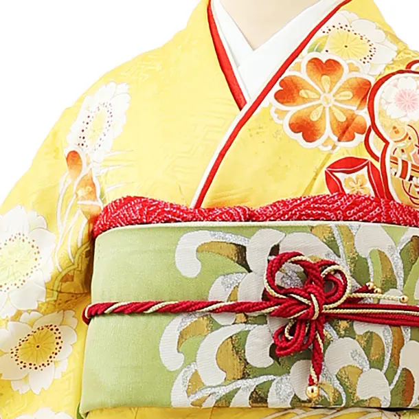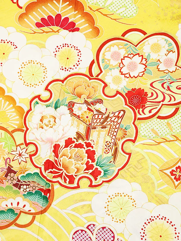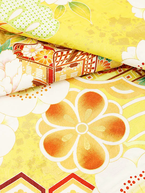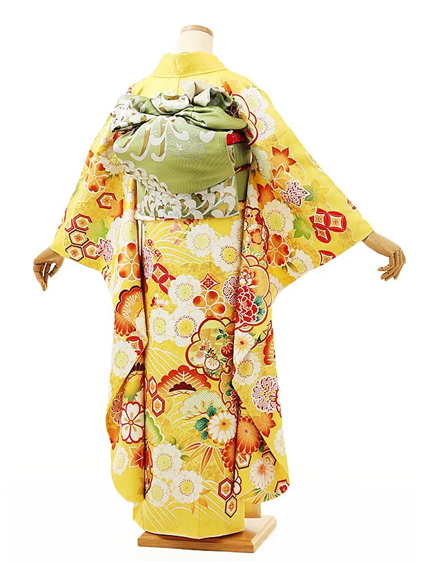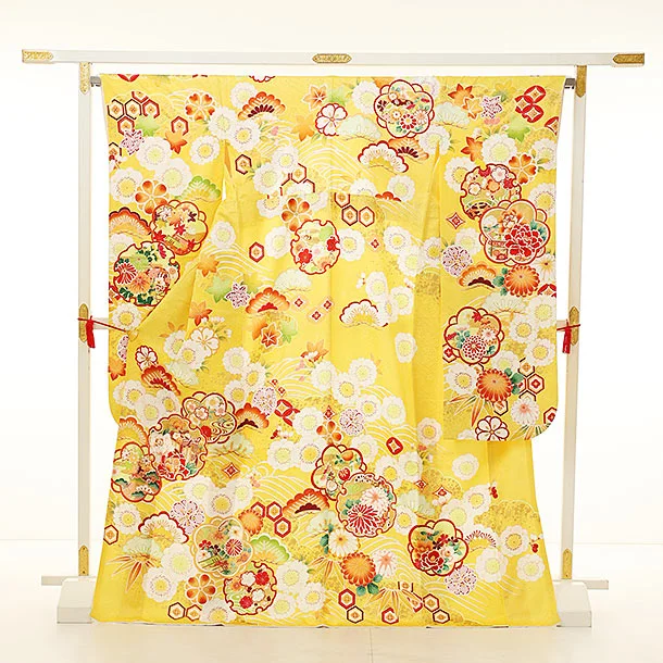 振袖レンタル1205 黄色地 雪輪御所車牡丹