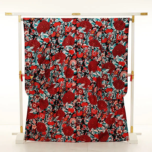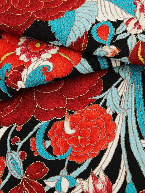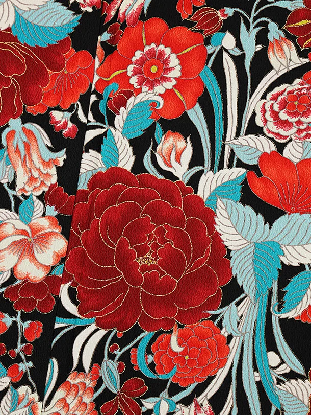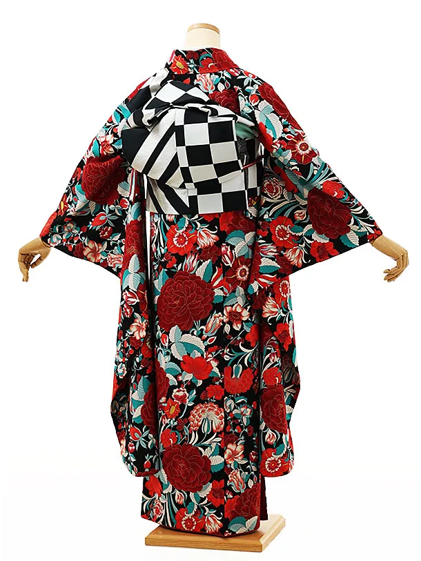 振袖レンタル1212 岡重 黒地 花づくし(化繊)