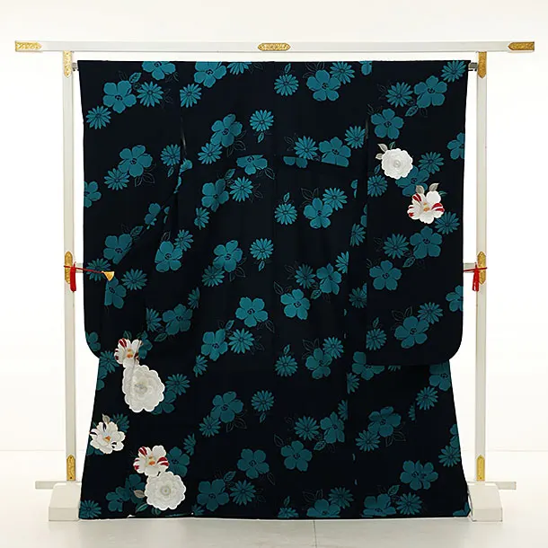 振袖レンタル1213 紺地 刺繍 椿牡丹(化繊)