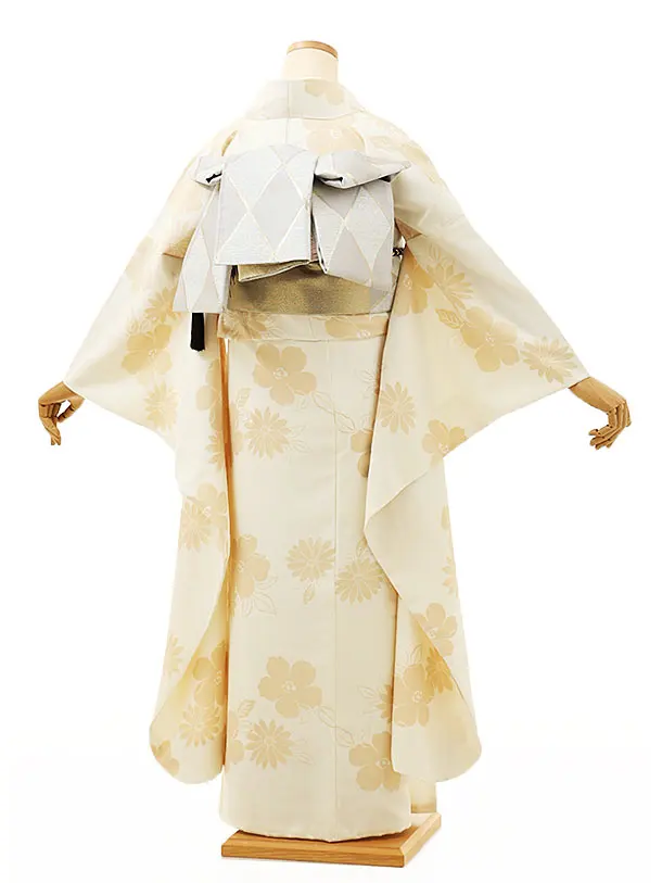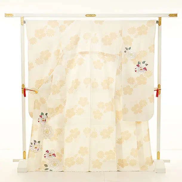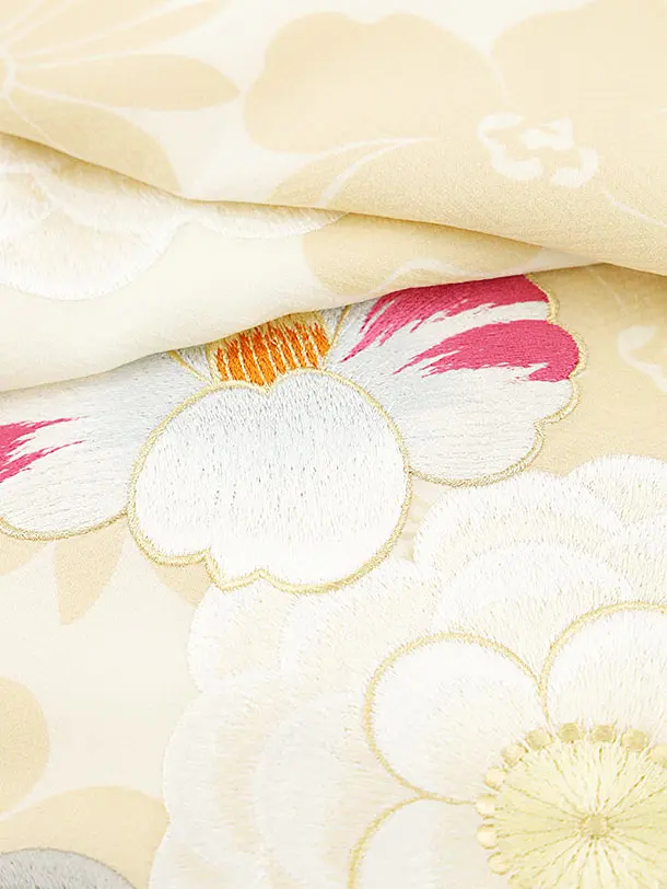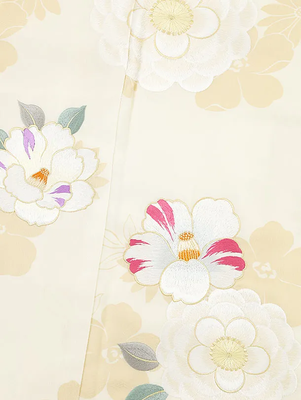 振袖レンタル1214 クリーム地 刺繍 椿牡丹(化繊)