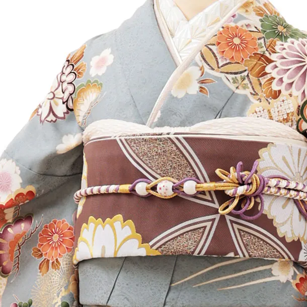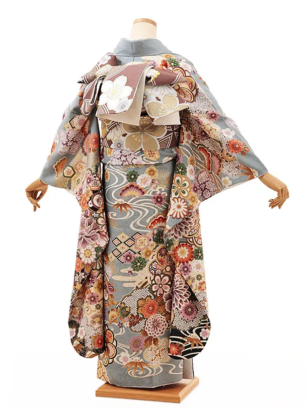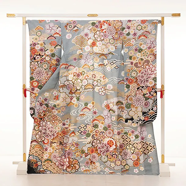 振袖レンタル1223 グレー 牡丹 ねじり梅毬