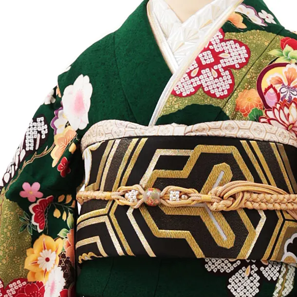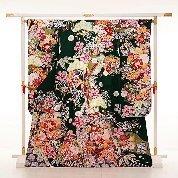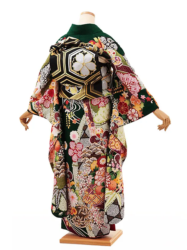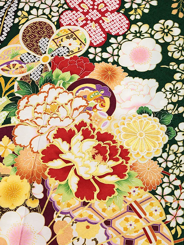振袖レンタル1228 緑色 梅に牡丹 扇