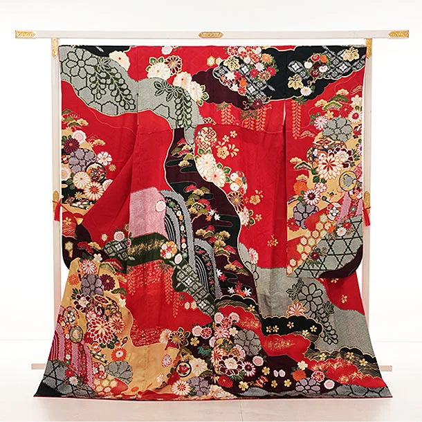 振袖レンタルQ1303 赤地 貝桶に疋田柄梅