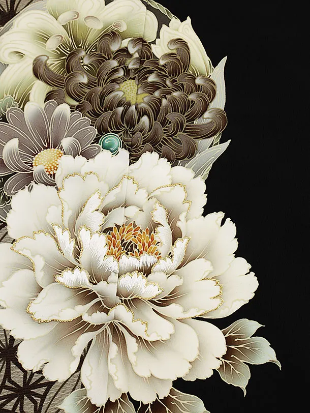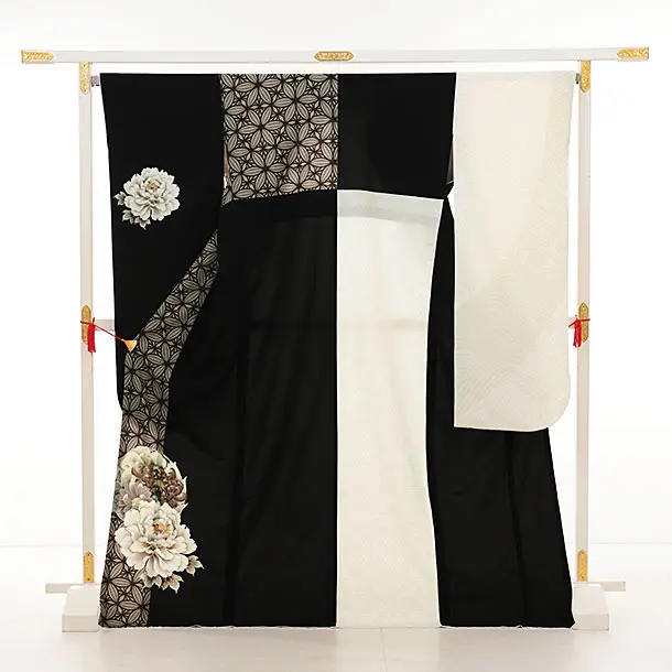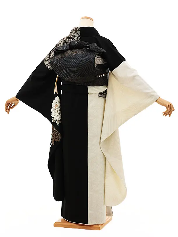 振袖レンタル1353 華徒然 黒クリーム片身替り 牡丹