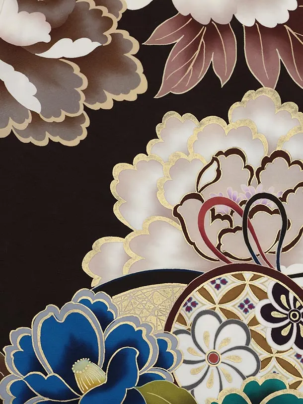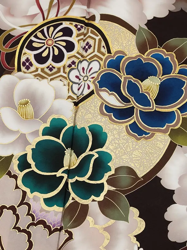 振袖レンタル1520 こげ茶 鞠に椿牡丹