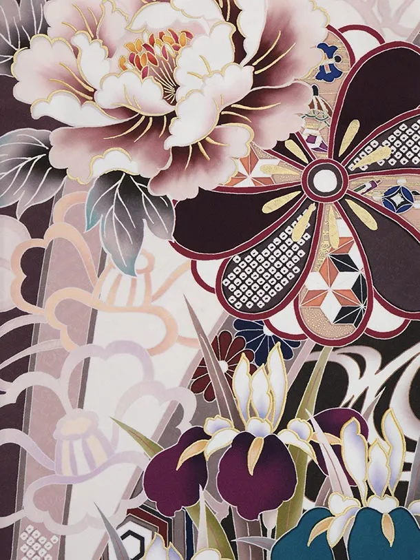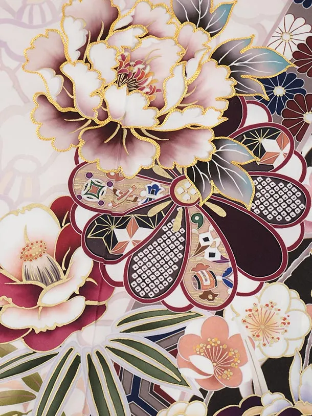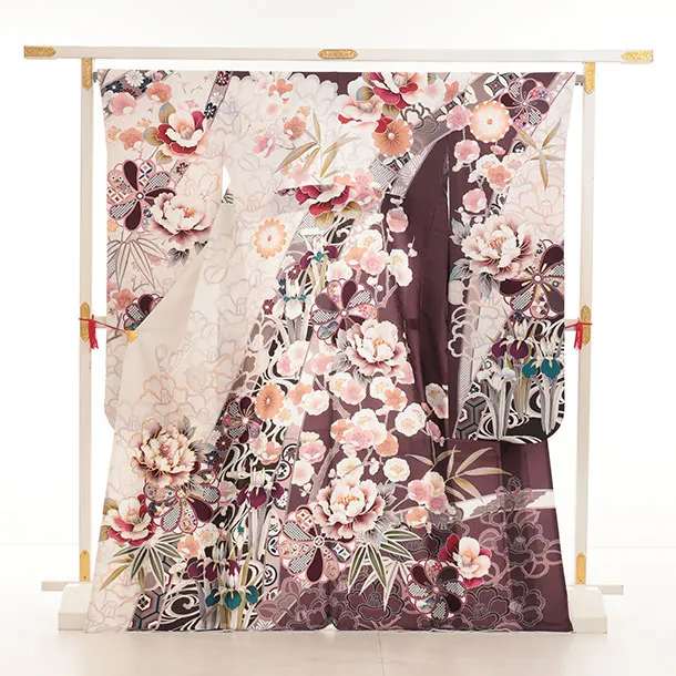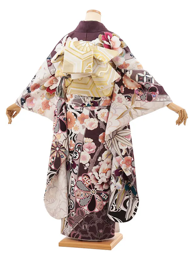 振袖レンタル1533 くすみパープル 白 牡丹椿