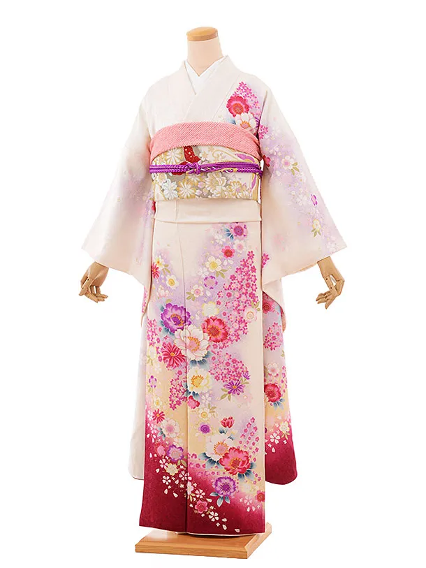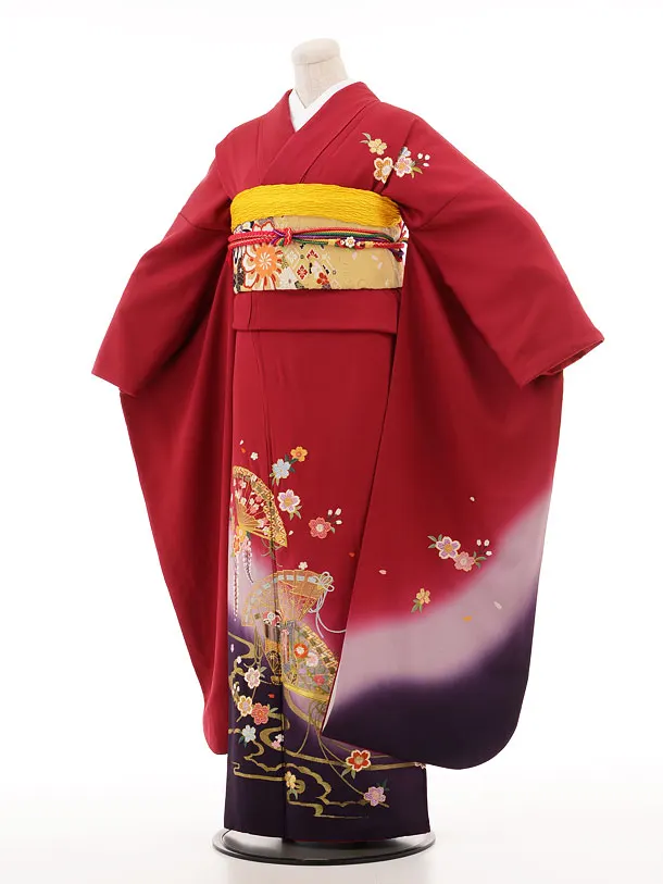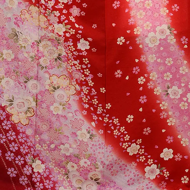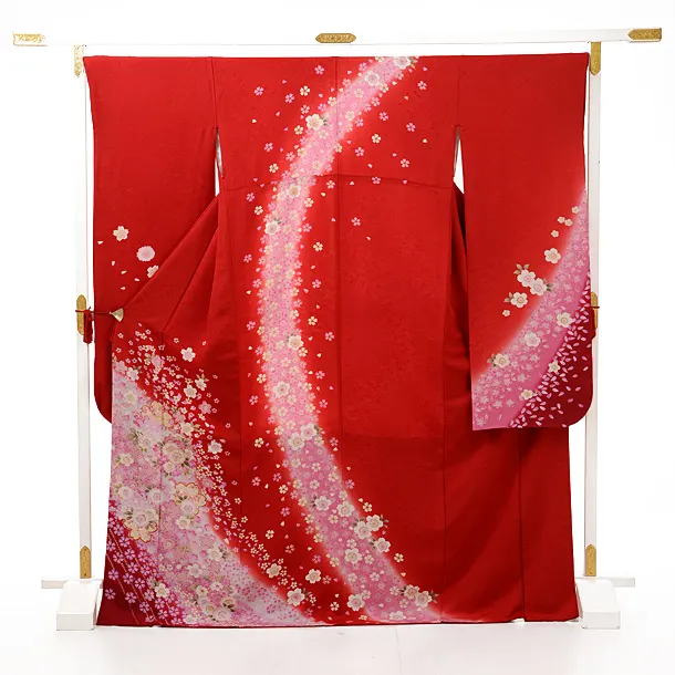 振袖レンタルE086赤ラメ淡ピンクぼかし桜