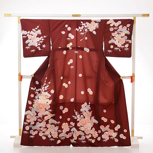 訪問着レンタル tcQ660 エンジ色地 ぼたん 貝桶