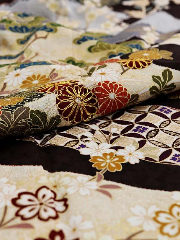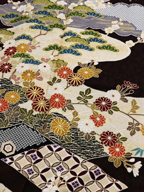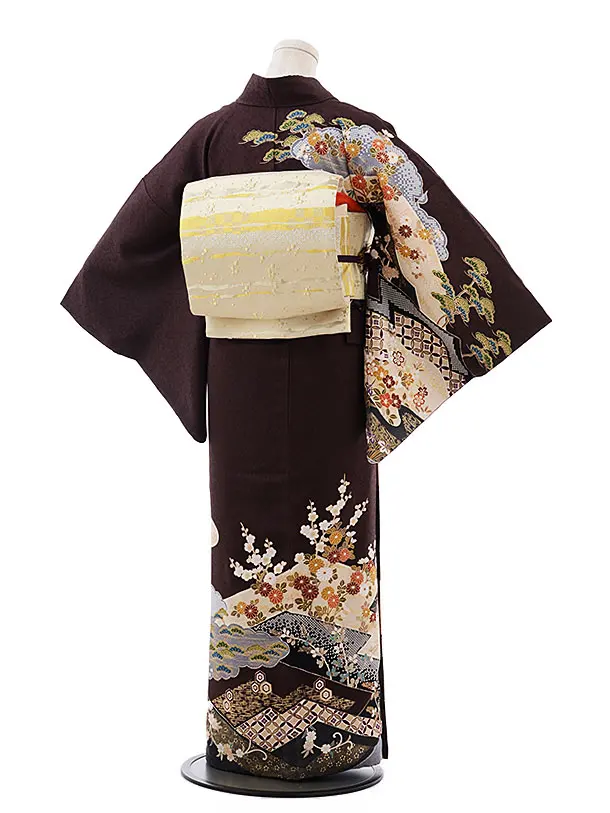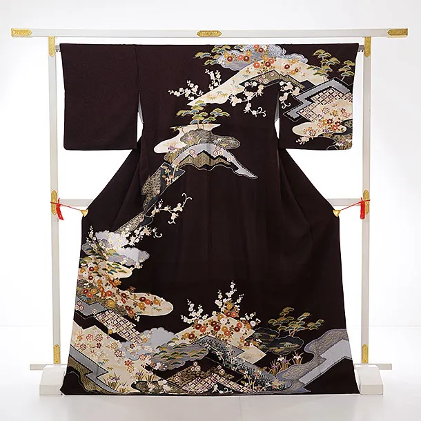 訪問着レンタル763 濃茶地 雲取り 七宝 金駒 刺しゅう