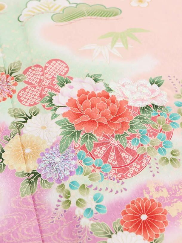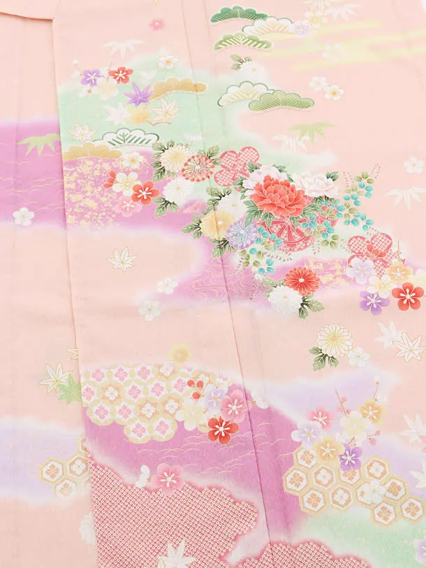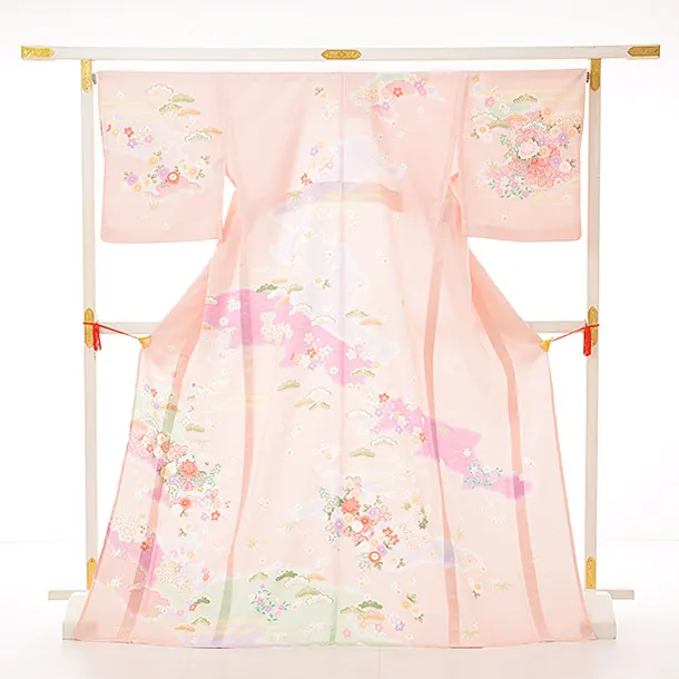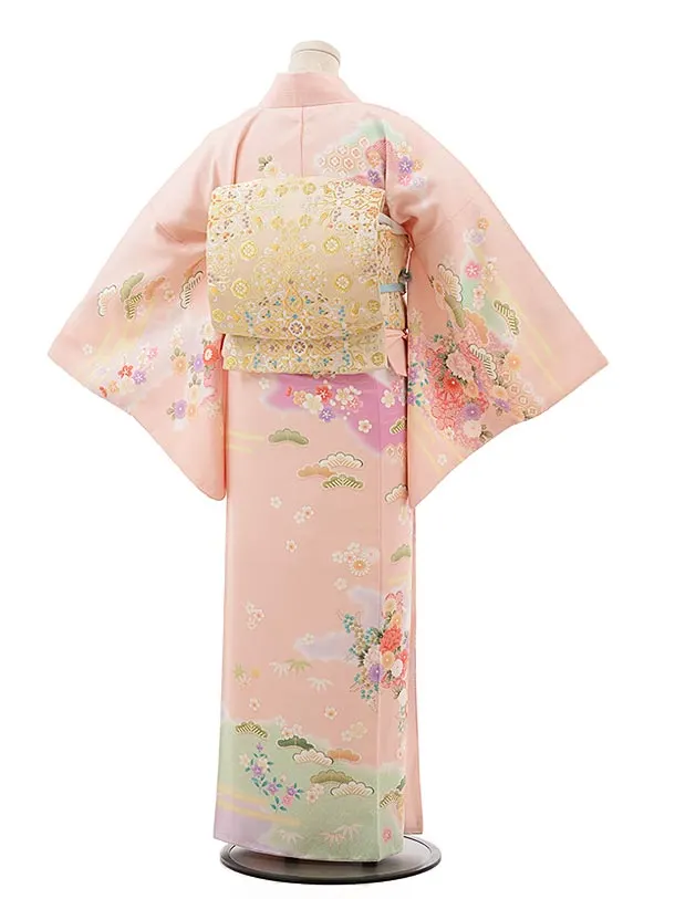 夏訪問着レンタル 単衣 Q838 薄ピンク色 霞に花車