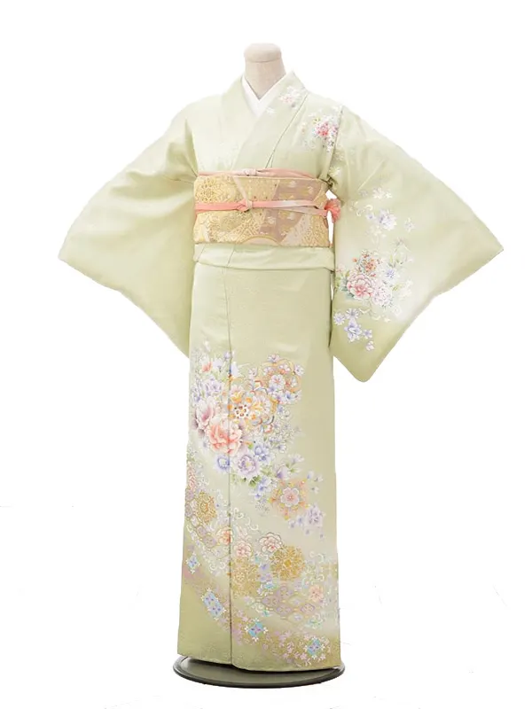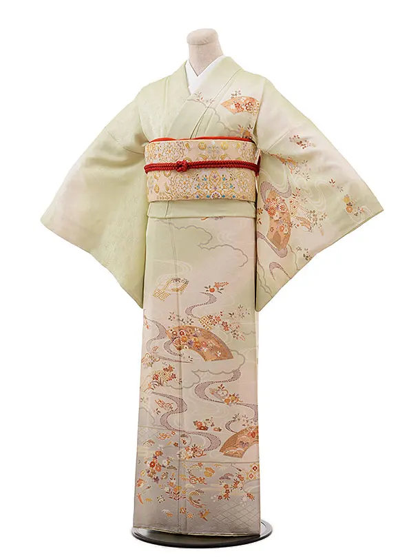 訪問着レンタルt866 ヒワ色 扇絵 梅菊