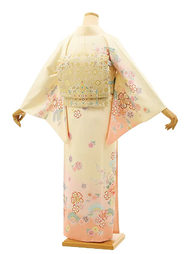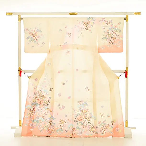 訪問着tc907 クリーム色ピンクぼかし貝桶牡丹