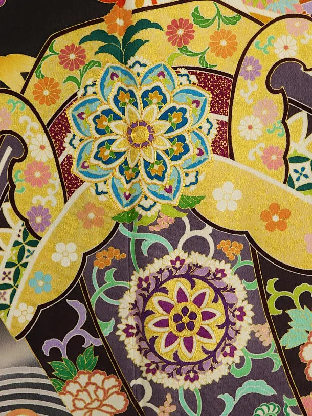 その中に四季の花や宝尽くし、割付け文様等の様々な吉祥文様を全体に加えた豪華絢爛な訪問着です。