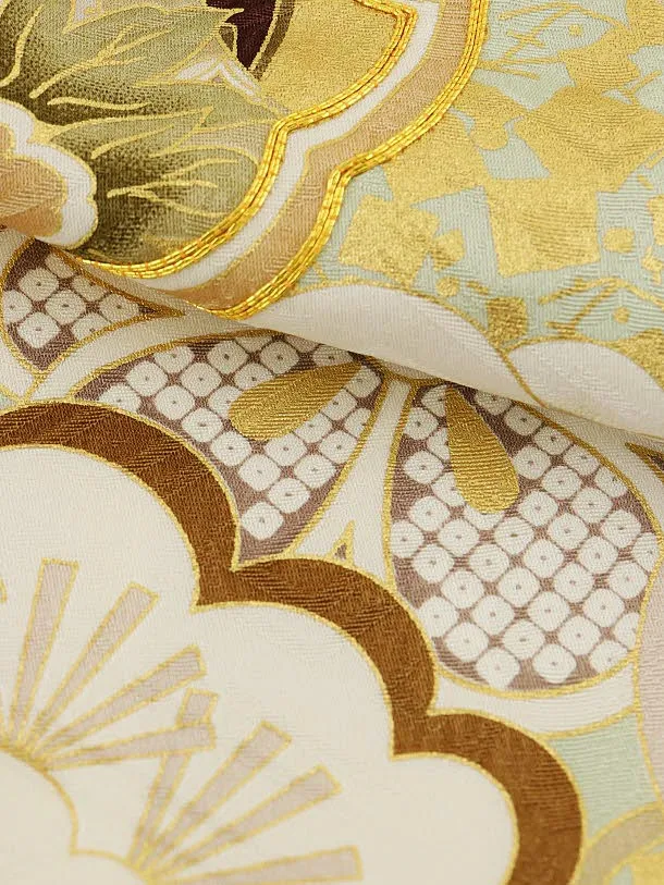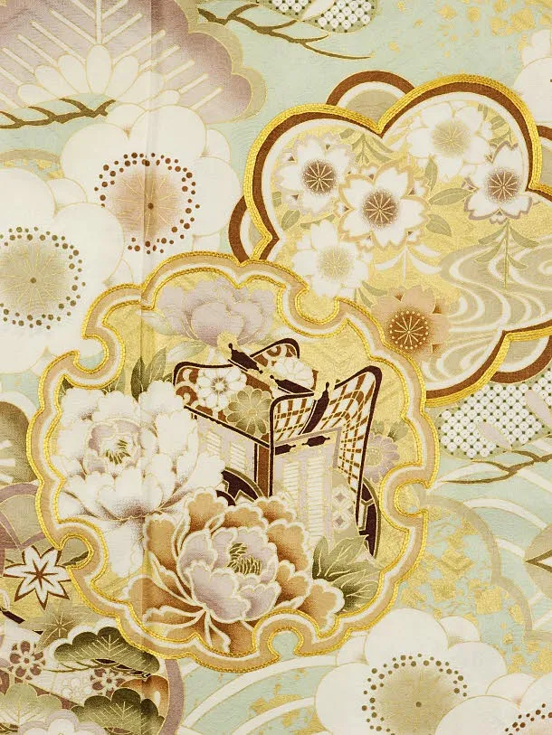 訪問着t947 ひわ色 雪輪に御所車 梅桜