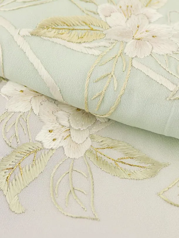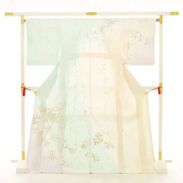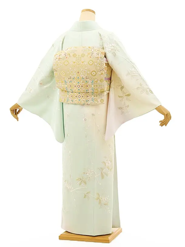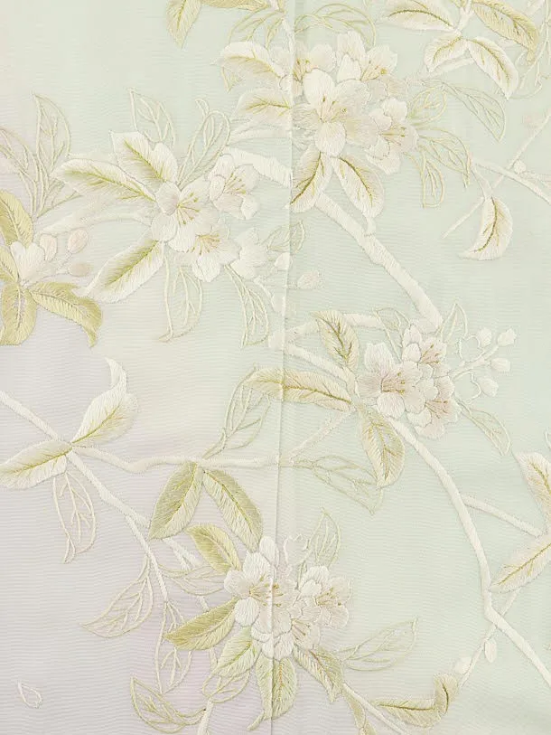 訪問着t949 クリーム色緑色ぼかし 刺繍桜