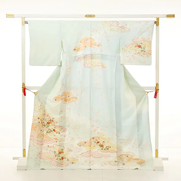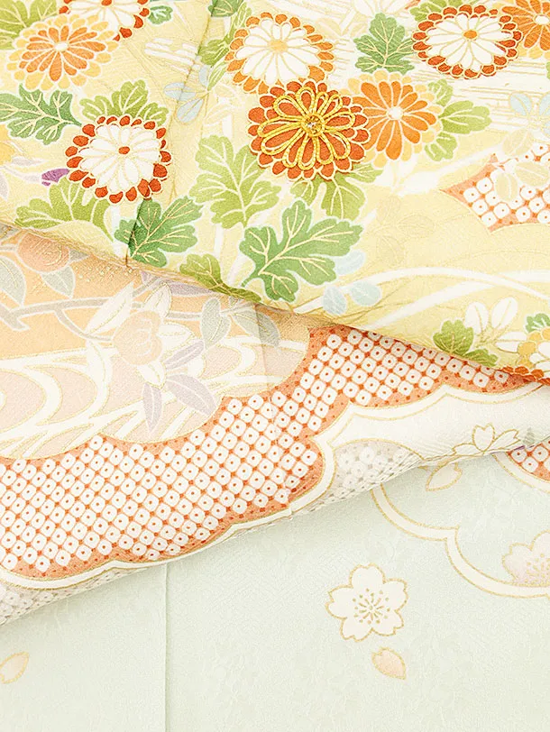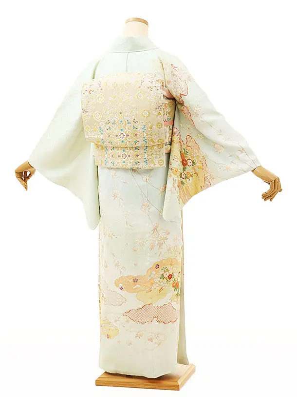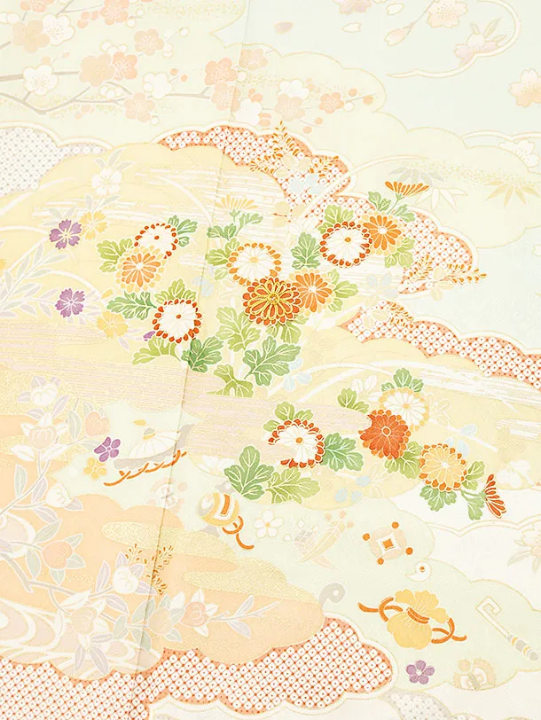 訪問着t1012 薄ヒワ色 雲取り宝尽し菊
