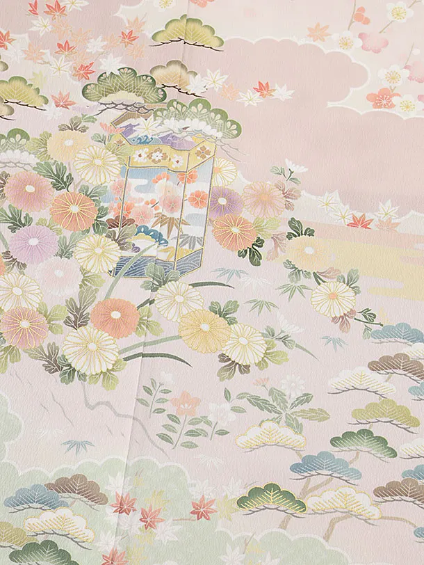 訪問着tQ1120 薄ピンク貝桶に四季花