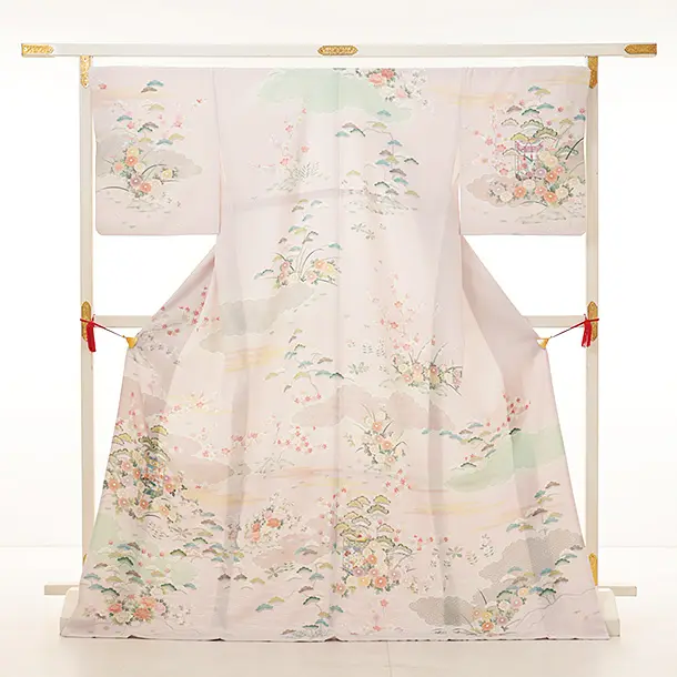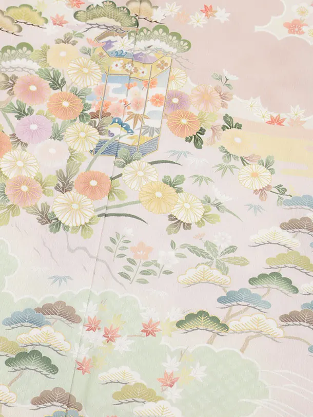 訪問着t1126 薄ピンク貝桶に四季花