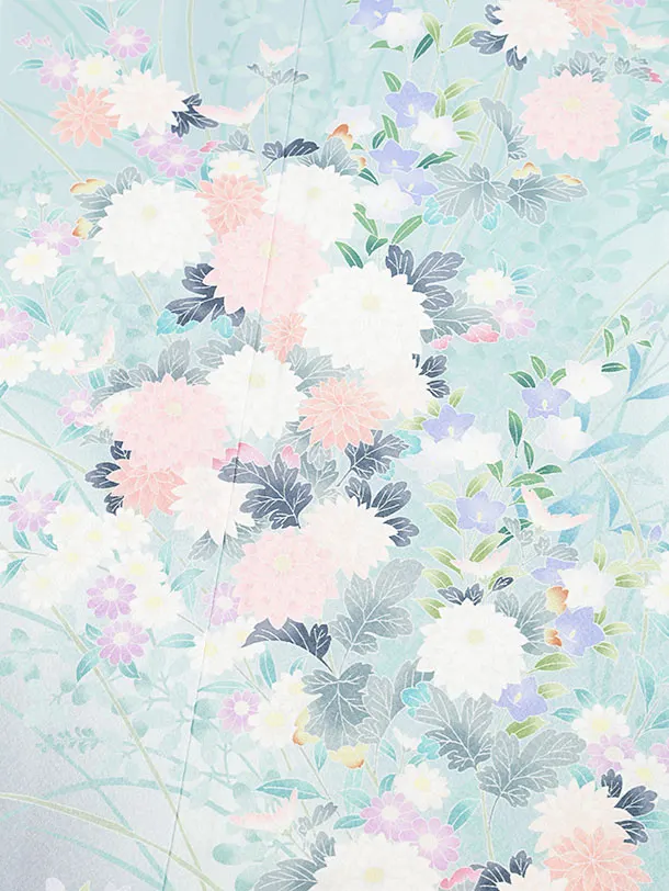 訪問着t1216 薄ブルーグリーン ぼかし桔梗に菊