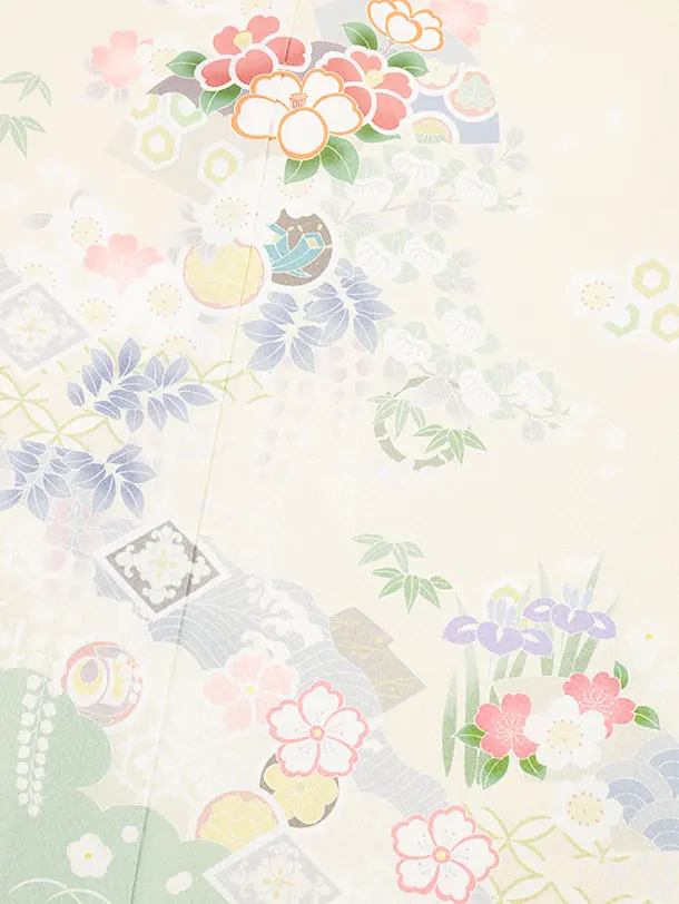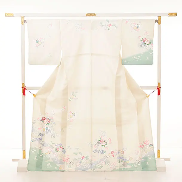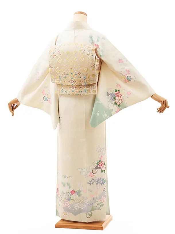 訪問着t1218 クリーム裾緑 四季花