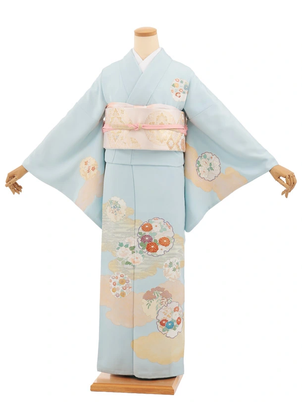 訪問着t1356 アイスブルー ぼかし 刺繍枝花