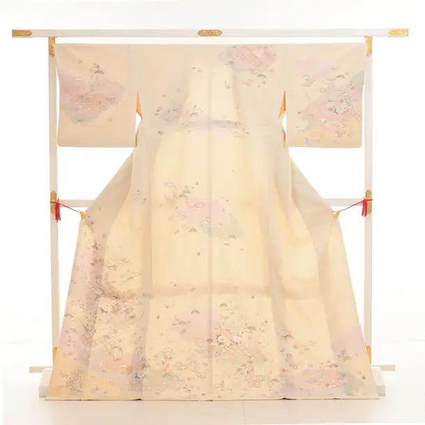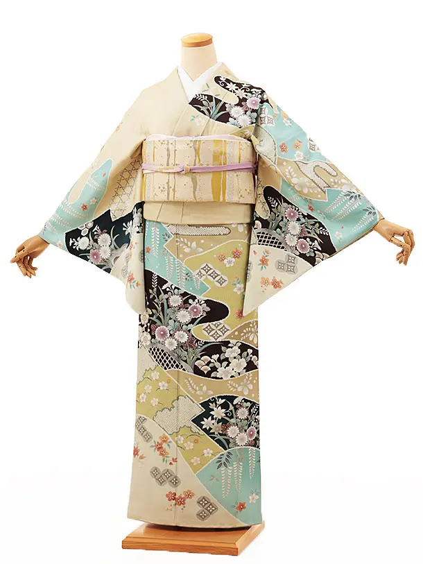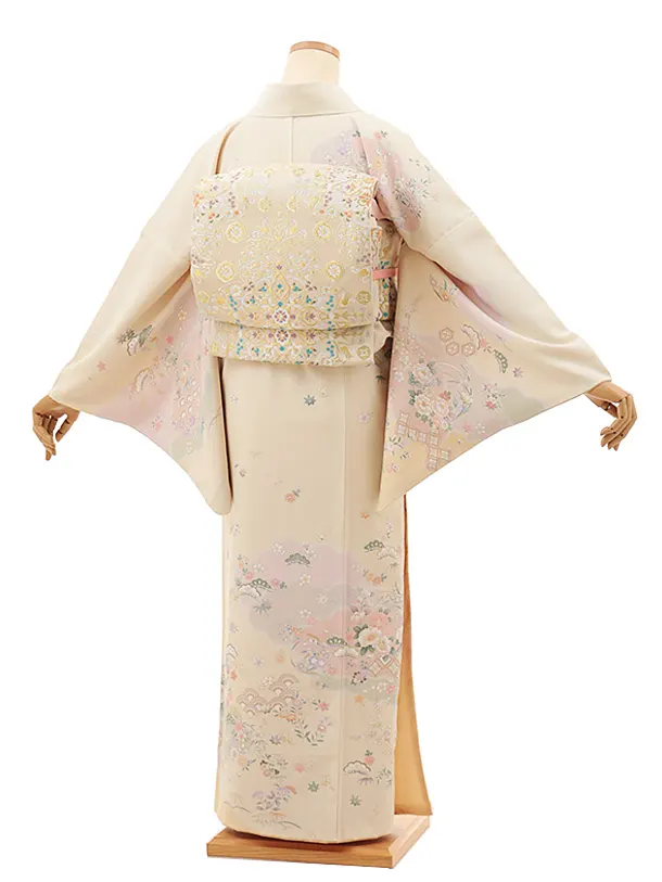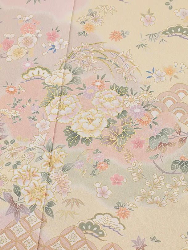 訪問着tQ1383 クリームベージュぼかし雲取りに四季花