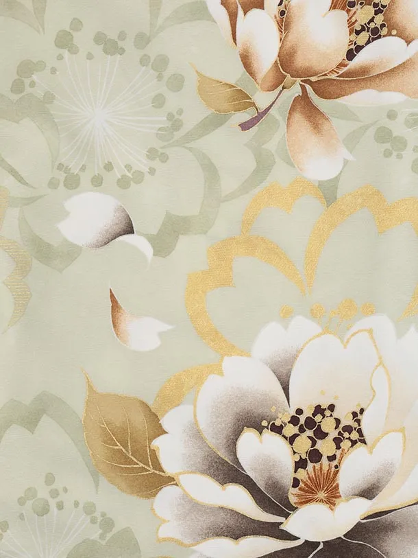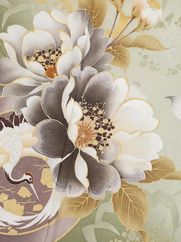 訪問着t1470 ペールグリーン 鶴文 牡丹