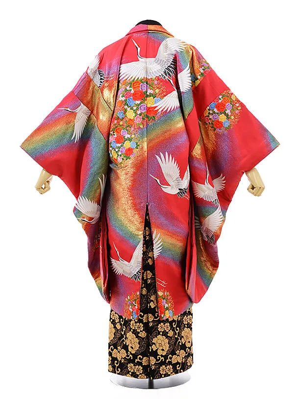 男性用袴men0070 黒地に風 紋服 ピンク レインボー 鶴(L)