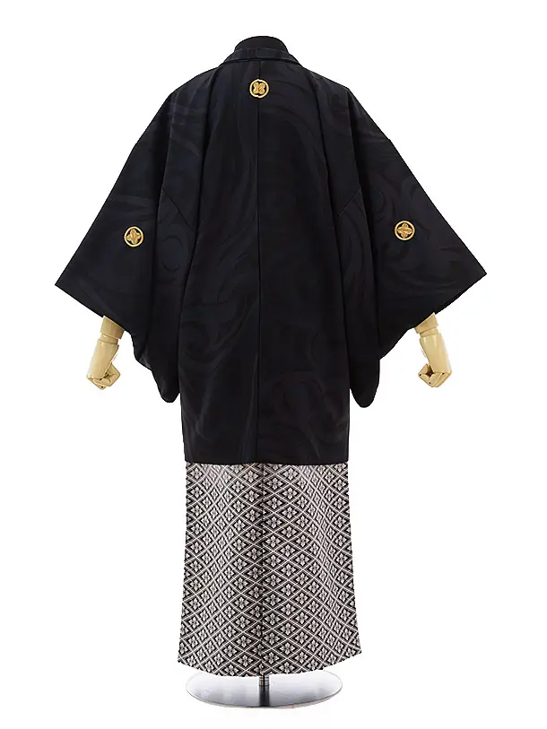 男性用袴men0073 黒地に風 紋付×白黒ぼかし菱(S)
