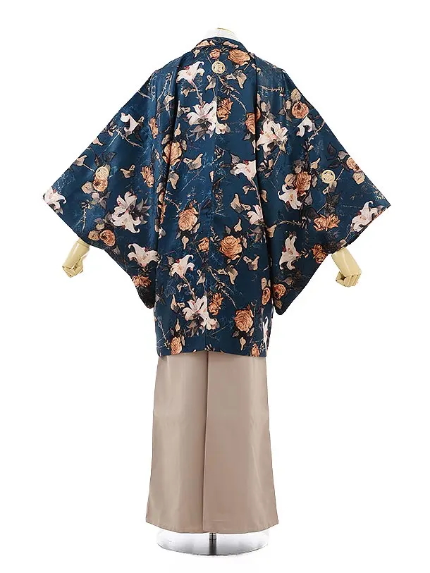 【馬乗型】男性用袴men0109ブルーグリーン地ゆりとバラ×ベージュ袴