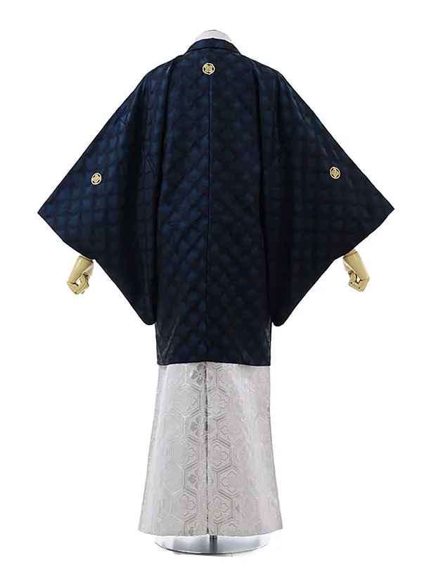 卒業式成人式袴レンタル148紺地うろこ紋付×シルバー袴(L)