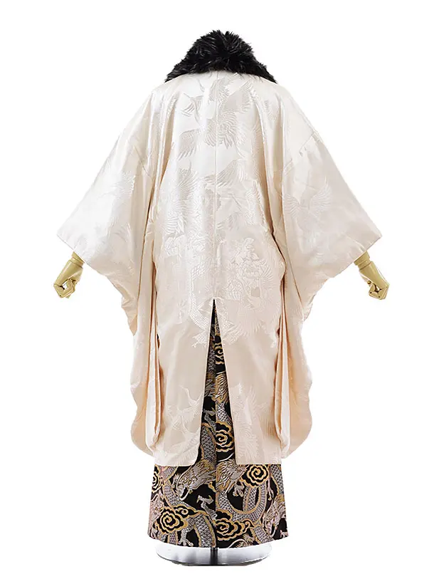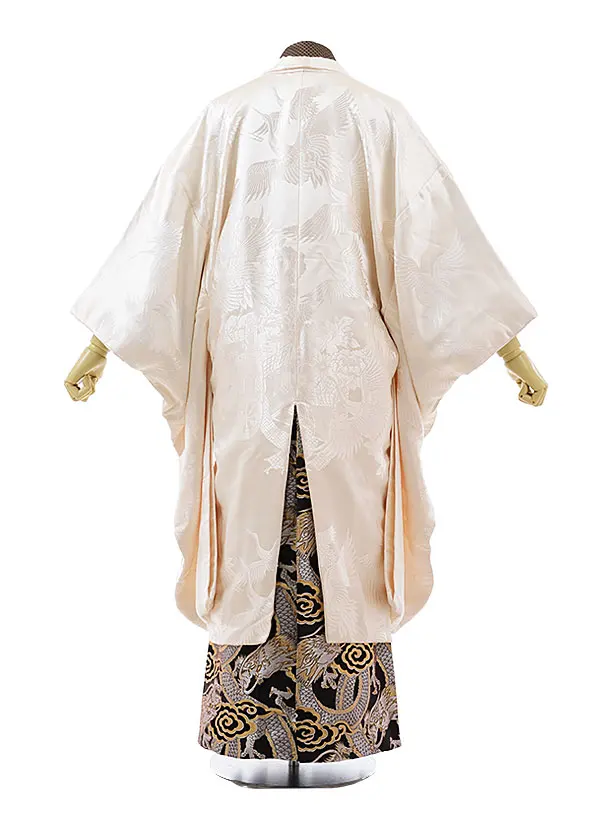 成人式袴レンタル156アイボリー花車に鶴×黒龍袴(L170~175㎝)