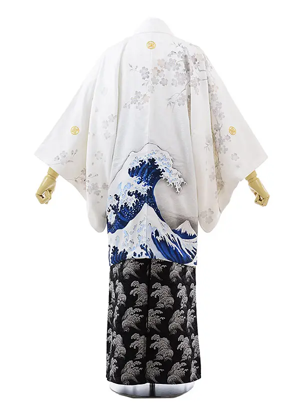 卒業式成人式袴レンタル162白地櫻に波×黒シルバー袴(L)