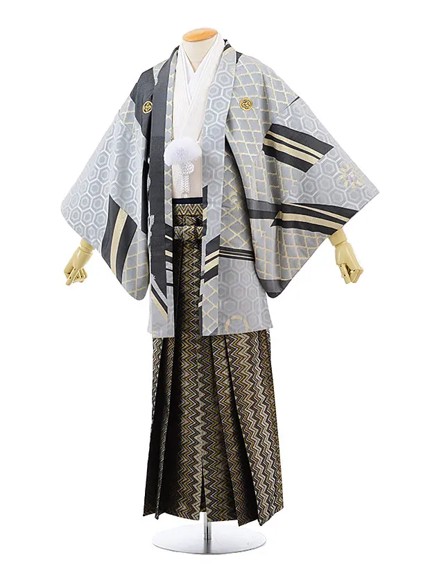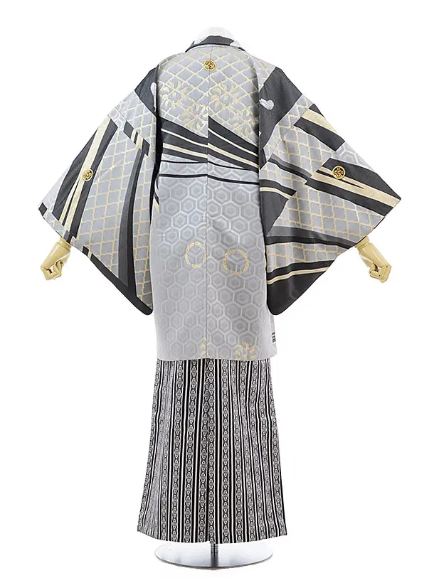 男性袴レンタル0187 グレー亀甲羽根 x 白黒縞袴(L)/170~175