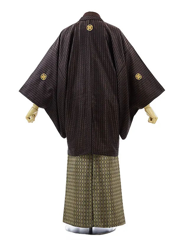 男性袴レンタル0204 ブラウン地 紋付 x 黒 ゴールド 袴