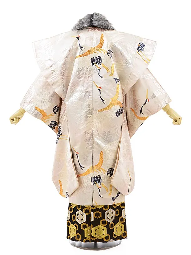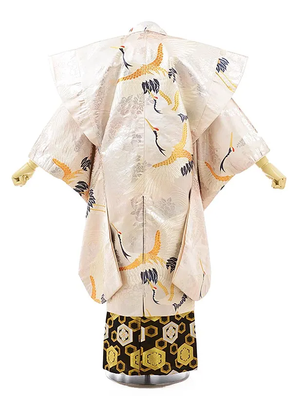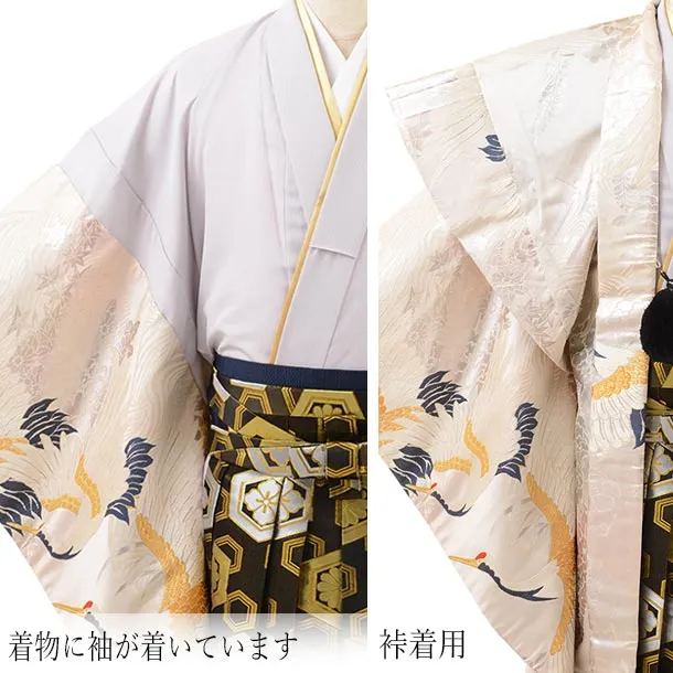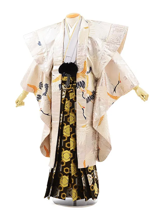 卒業式成人式袴レンタル211ベージュシルバー鶴×黒金亀甲(L)